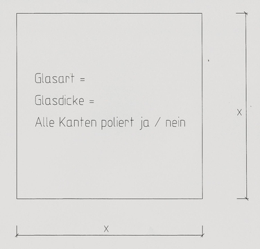 Bitte geben Sie die gewünschte Glasart (ESG, Float, Spiegel etc.), die Maße, sowie die Glasdicke und eventuelle Bohrungen an.